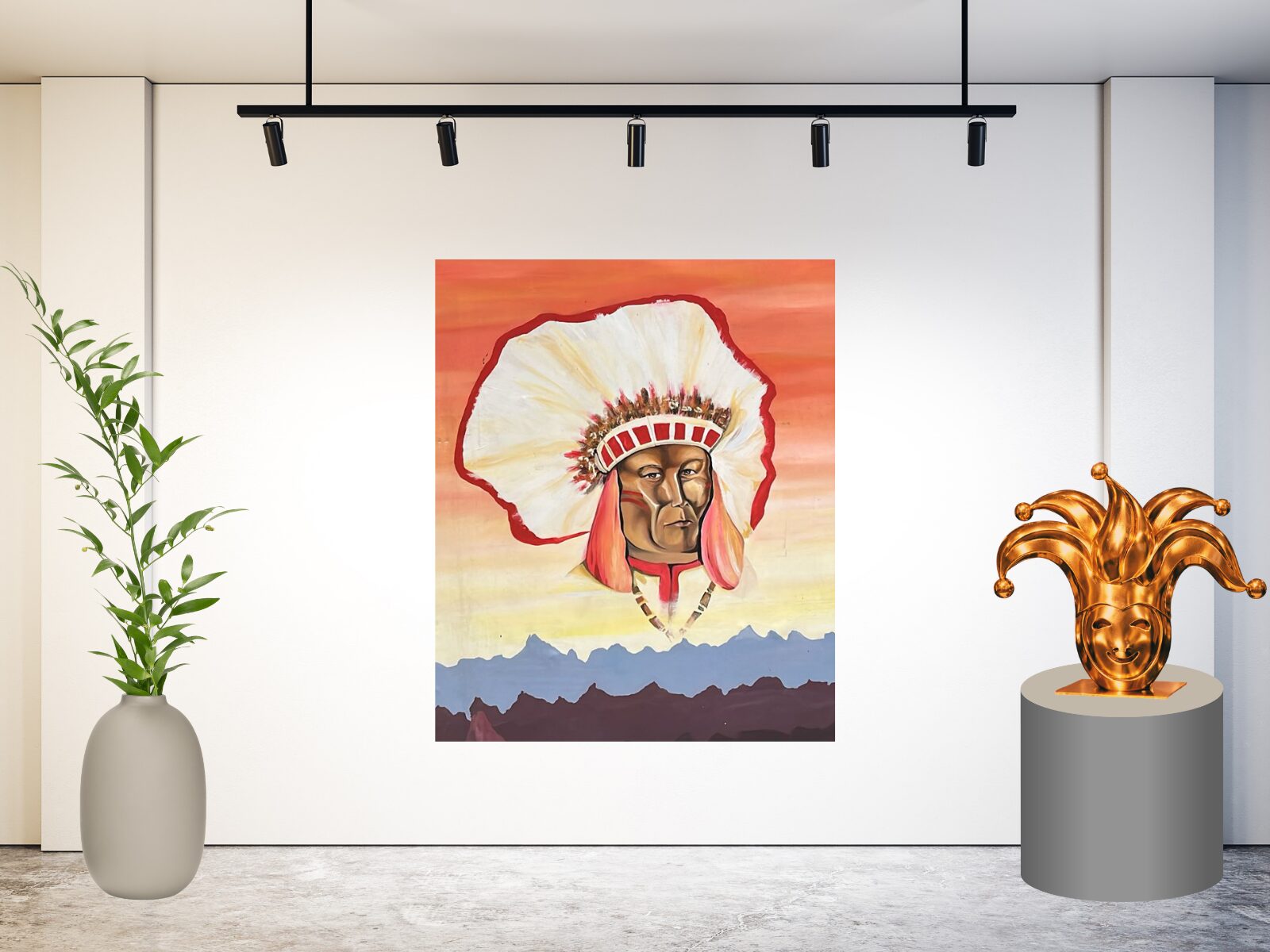 De centrale plaatsing van het gezicht en de gedetailleerde verentooi maken dit schilderij een echte blikvanger. Het werk straalt trots, traditie en historie uit en brengt direct een sfeer van het Amerikaanse Wilde Westen naar voren.
