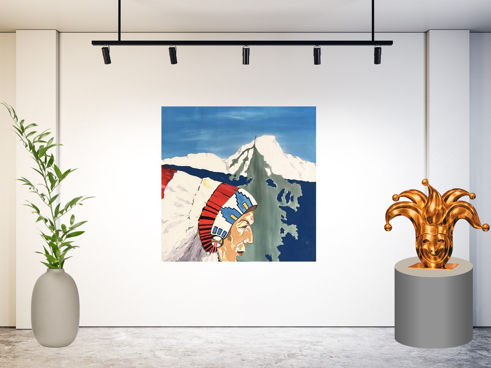 Schilderij 108 toont het profiel van een indiaanse man met traditionele verentooi, afgebeeld tegen een indrukwekkend berglandschap. De combinatie van diepe blauwtinten in de lucht en de witte bergtoppen geeft het schilderij een frisse en krachtige uitstraling. Een eenzame boom in het midden van de compositie versterkt het gevoel van natuur en uitgestrektheid.