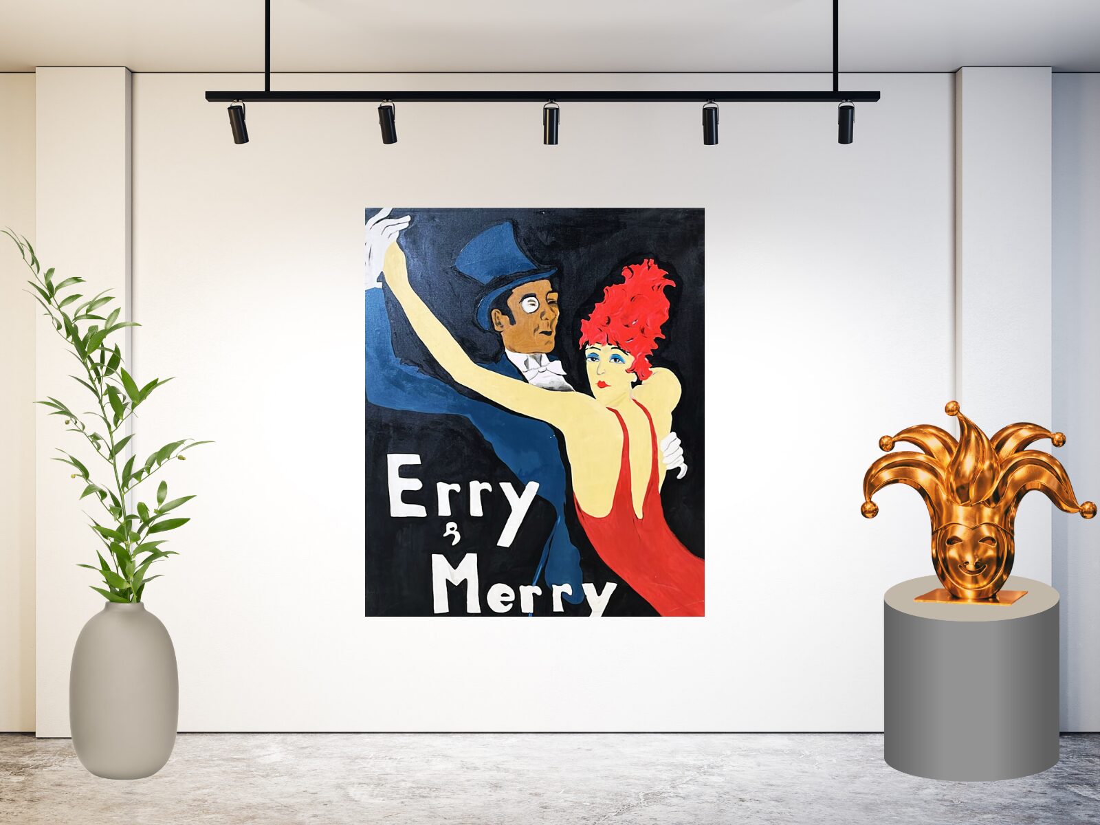 De donkere achtergrond laat de krachtige kleuren en expressieve houdingen extra goed naar voren komen. Het schilderij straalt glamour, energie en feestelijke elegantie uit.