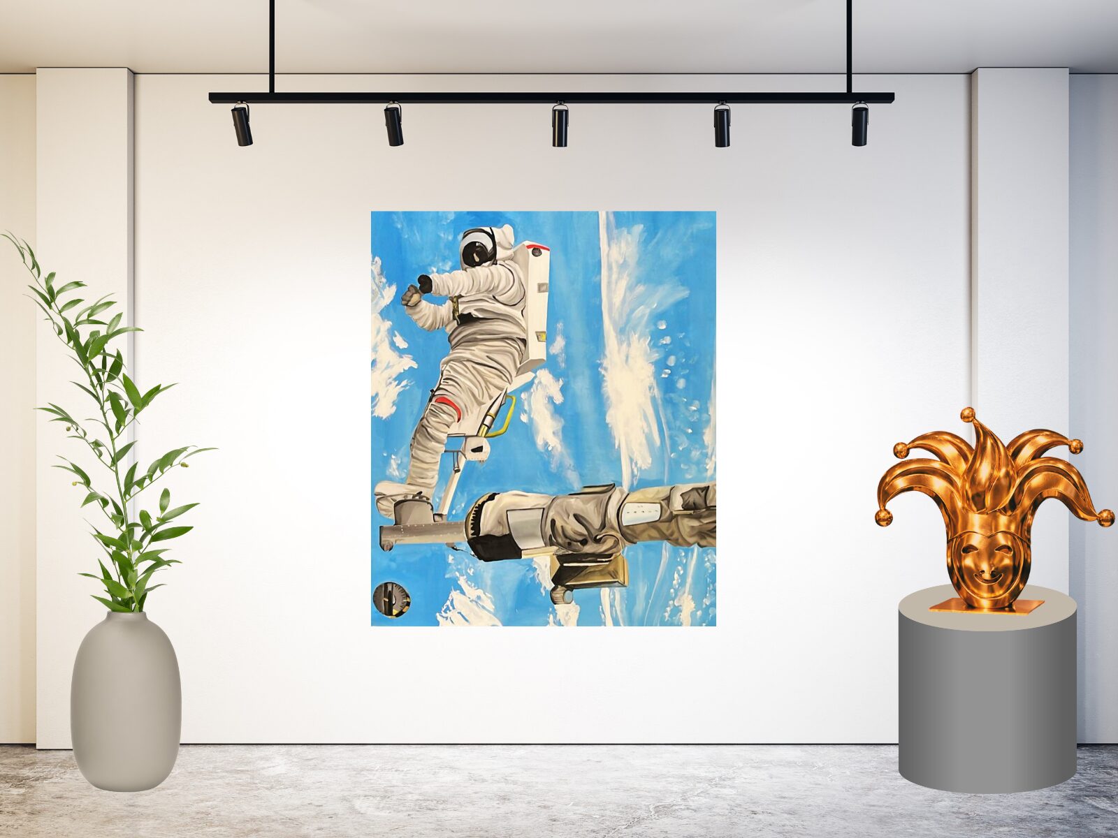 Schilderij 114 toont een indrukwekkende ruimtewandeling van een astronaut, zwevend boven de aarde tegen een helderblauwe achtergrond met wolkenpartijen. De gedetailleerde weergave van het ruimtepak en de technische elementen geeft het werk een realistische en krachtige uitstraling.