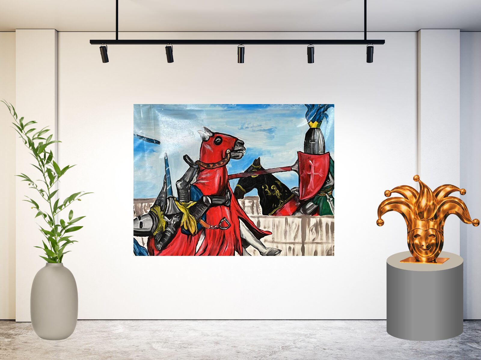 De combinatie van metalen harnassen, wapens en paarden roept direct de sfeer op van kastelen, toernooien en ridderlijke strijd. Het schilderij straalt moed, traditie en historische grandeur uit.