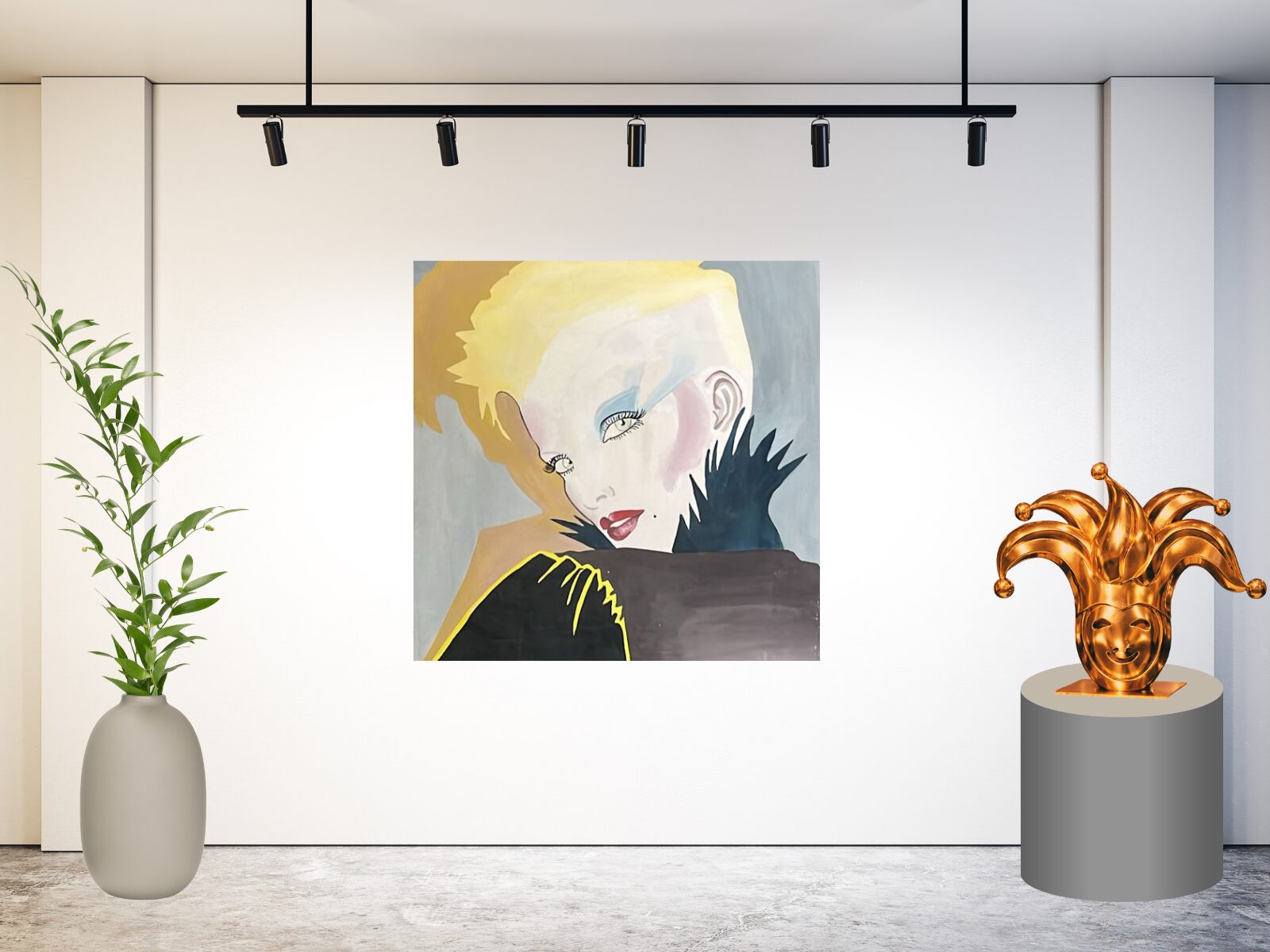Schilderij 129 toont een krachtig en modern portret van een stijlvolle vrouw met een korte, blonde coupe en opvallende make-up. De lichte huidtinten en zachte achtergrond worden versterkt door donkere accenten in kleding en kraag, waardoor het gezicht extra naar voren komt.