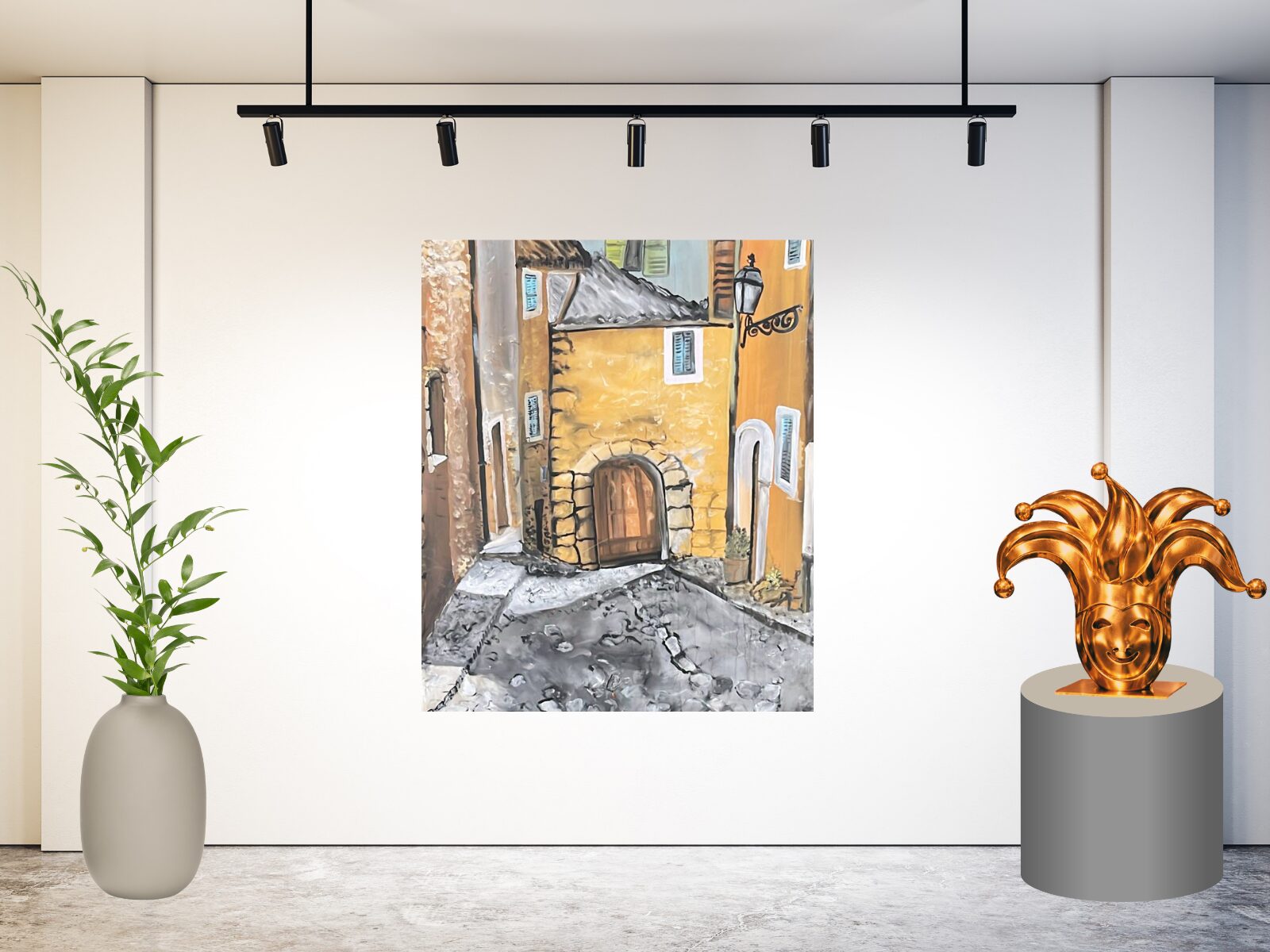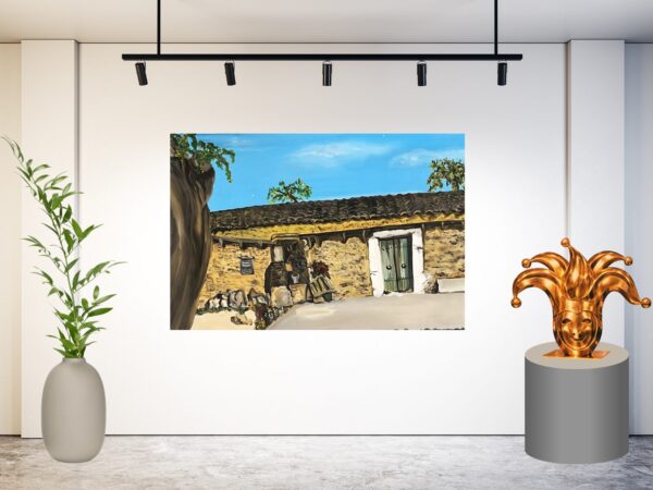 Schilderij 134 toont een sfeervol, smal straatje met warme geel- en oranjetinten die direct doen denken aan een pittoresk Italiaans dorpje. De stenen gevels, houten deur en karakteristieke straatlantaarn geven het geheel een authentieke, mediterrane uitstraling.