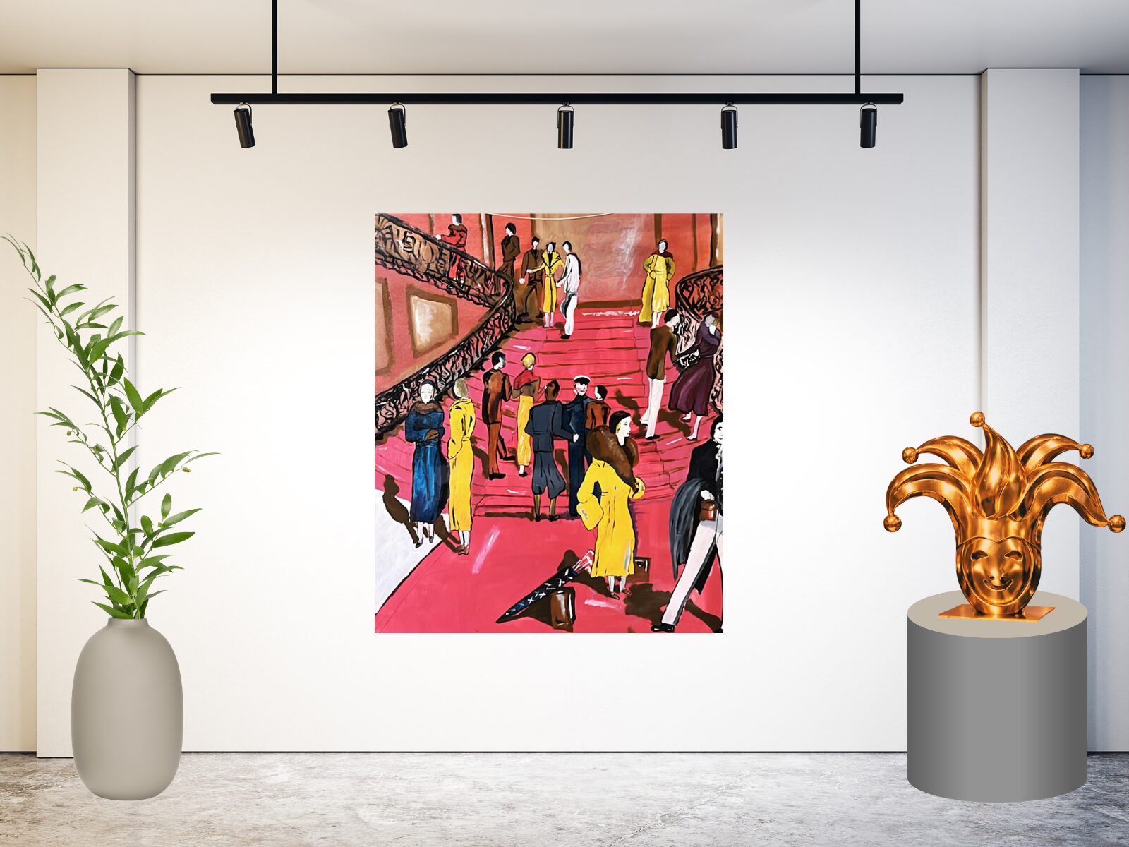 Schilderij 135 toont een stijlvolle en dynamische scène van elegant geklede gasten die zich bewegen over een grote rode trap. De warme roodtinten van de trap en muren vormen een krachtig decor voor de contrasterende kleding in geel, blauw en donkere tinten.