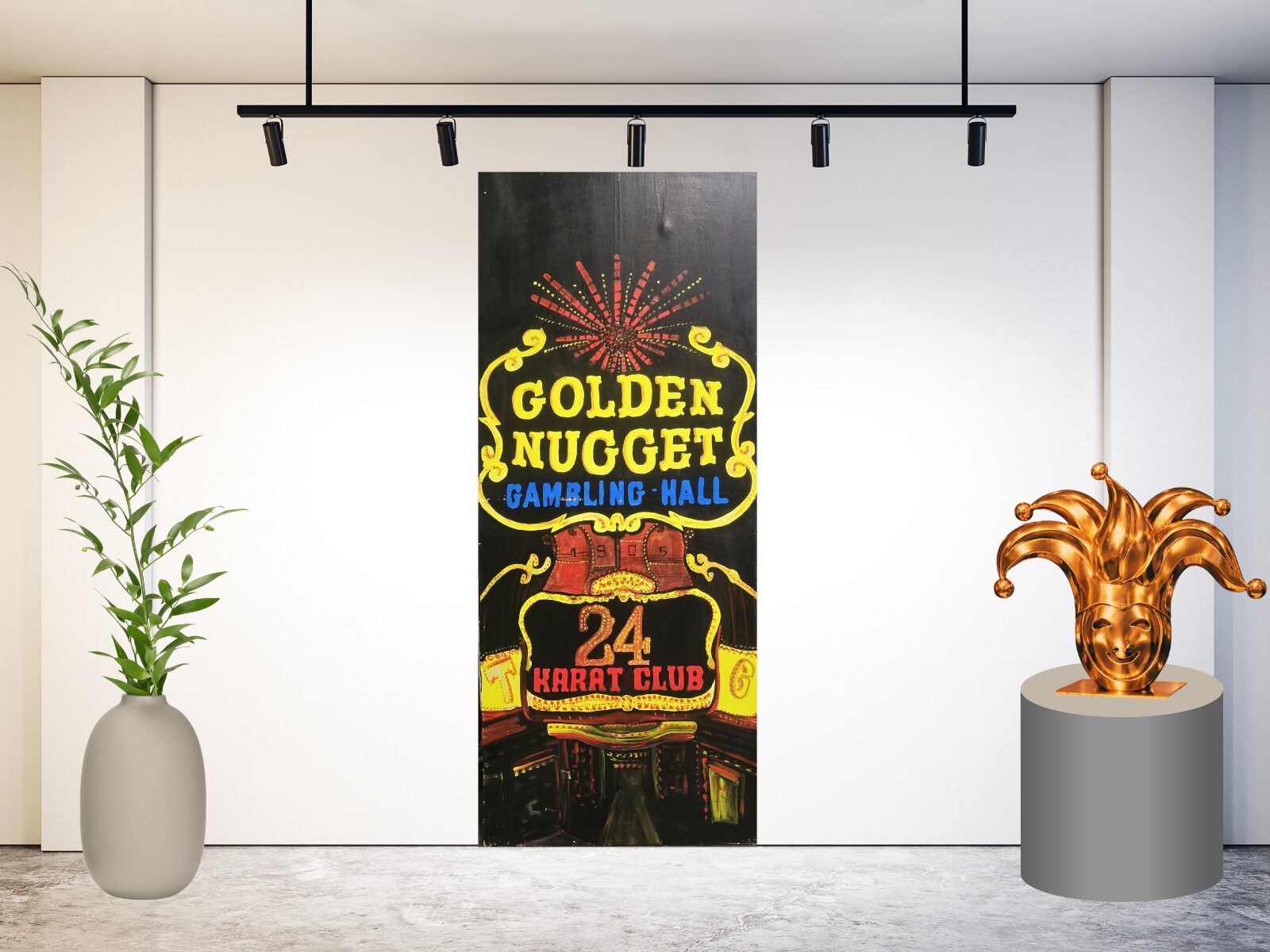 Schilderij 19 brengt direct de sfeer van de beroemde Las Vegas Strip tot leven. Met de opvallende teksten “Golden Nugget Gambling Hall” en “24 Karat Club” straalt dit decorstuk pure casino-energie uit. De combinatie van warme goudtinten, roodtinten en het donkere nachtdecor geeft het schilderij een echte neonreclame-uitstraling.