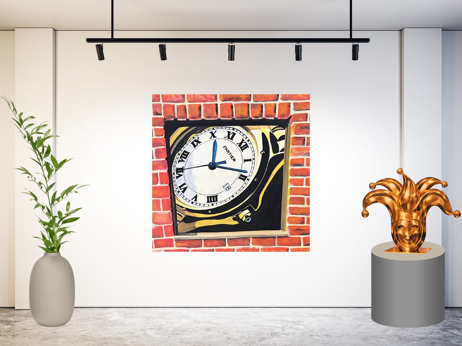 De bakstenen rand zorgt voor een industrieel karakter, terwijl de klok zelf een tijdloos en elegant element toevoegt. Dit maakt het schilderij veelzijdig inzetbaar binnen verschillende thema’s.