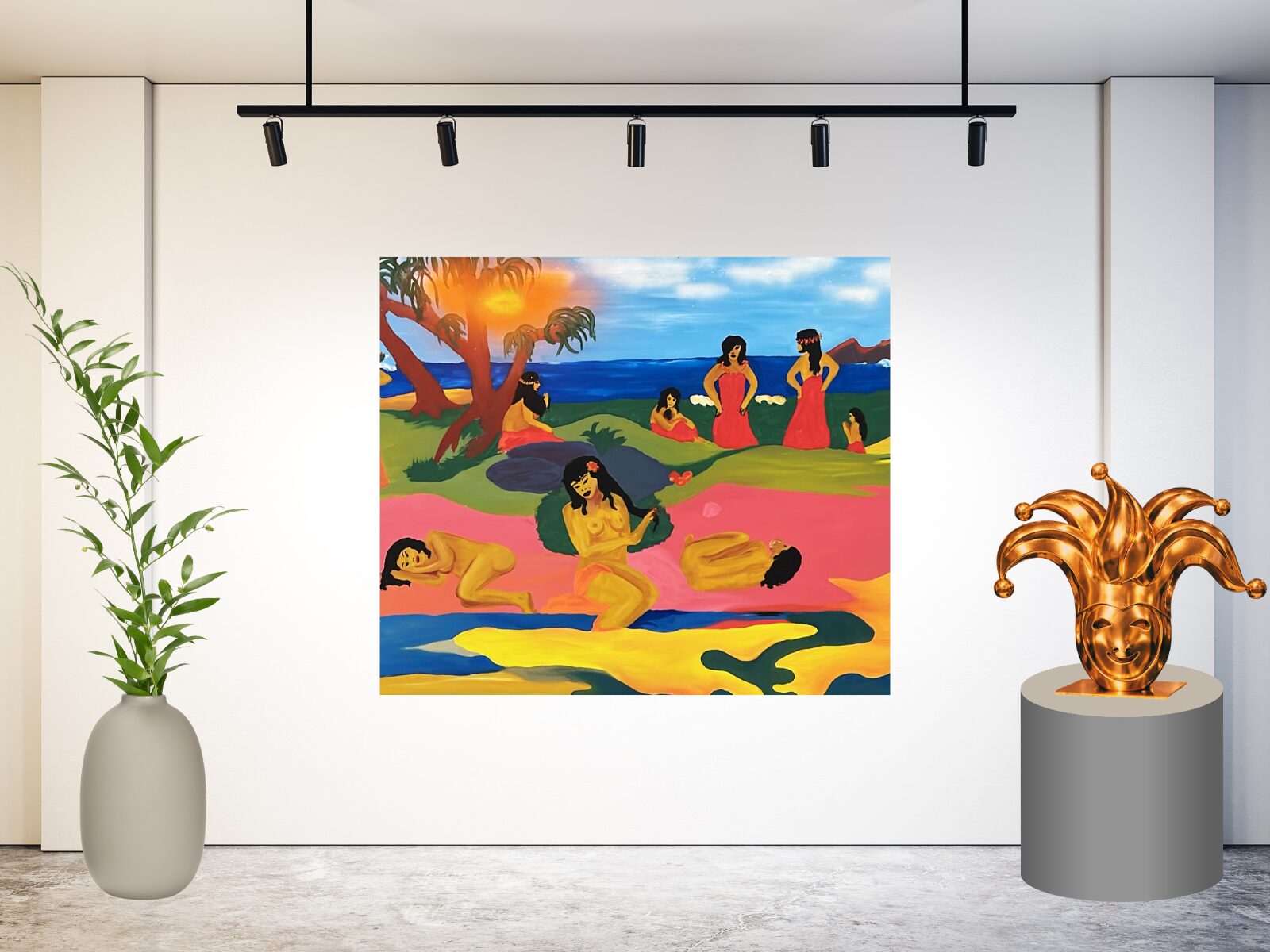 De compositie is speels en dynamisch, met verschillende figuren die rusten, zitten of staan in het landschap. Het schilderij ademt warmte, vrijheid en een ontspannen eilandsfeer.