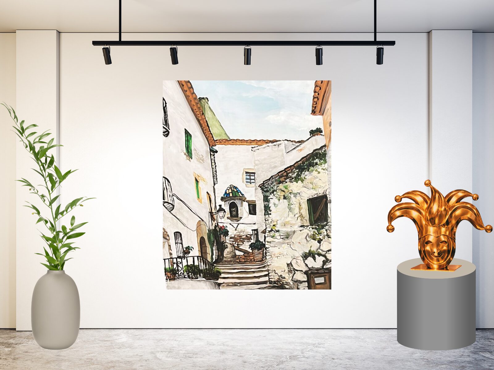 De speelse lijnen van de steeg en de trap leiden het oog naar boven, waar een kleine kapelachtige nis en sfeervolle details zorgen voor extra karakter. Het schilderij ademt rust, zon en het gevoel van een wandeling door een pittoresk dorpje in Italië of Spanje.
