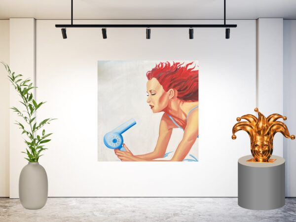 De warme, effen achtergrond zorgt ervoor dat de figuur direct de aandacht trekt. De combinatie van klassieke kleuren en de vintage uitstraling doet denken aan circus, variété en oude theatershows.