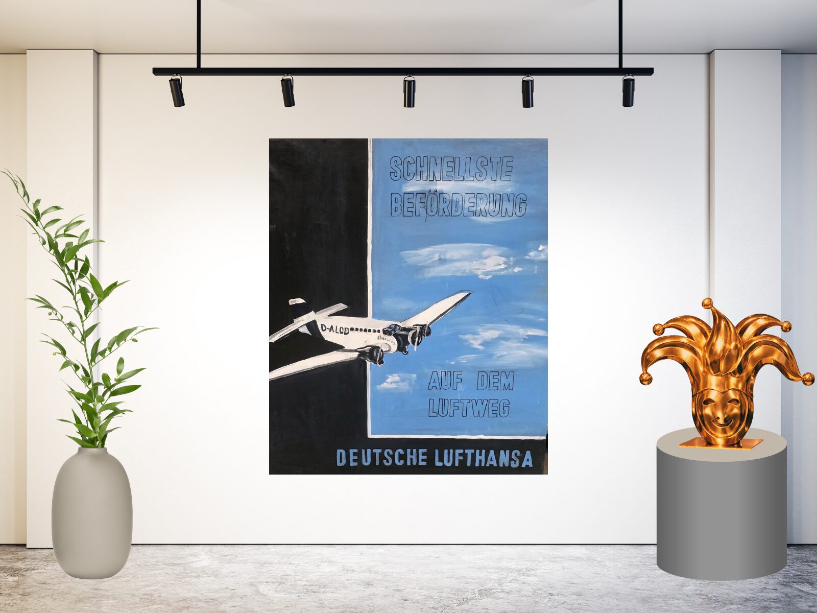 Schilderij 9 is een karaktervol kunstwerk in retro-stijl, geïnspireerd op een klassieke luchtvaartposter van Deutsche Lufthansa. Het schilderij toont een historisch vliegtuig dat krachtig door de lucht vliegt, verdeeld over een zwart en blauw vlak. De typografie en vlakverdeling geven het werk een grafisch en bijna affiche-achtig karakter.