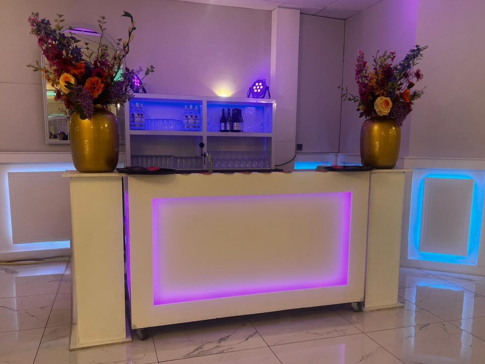 De Witte Ledbar Klein met Luxe Bloemen is een elegante en moderne toevoeging aan ieder evenement. De strakke witte bar in combinatie met sfeervolle LED-verlichting zorgt voor een luxe uitstraling die volledig naar wens aan te passen is in kleur.